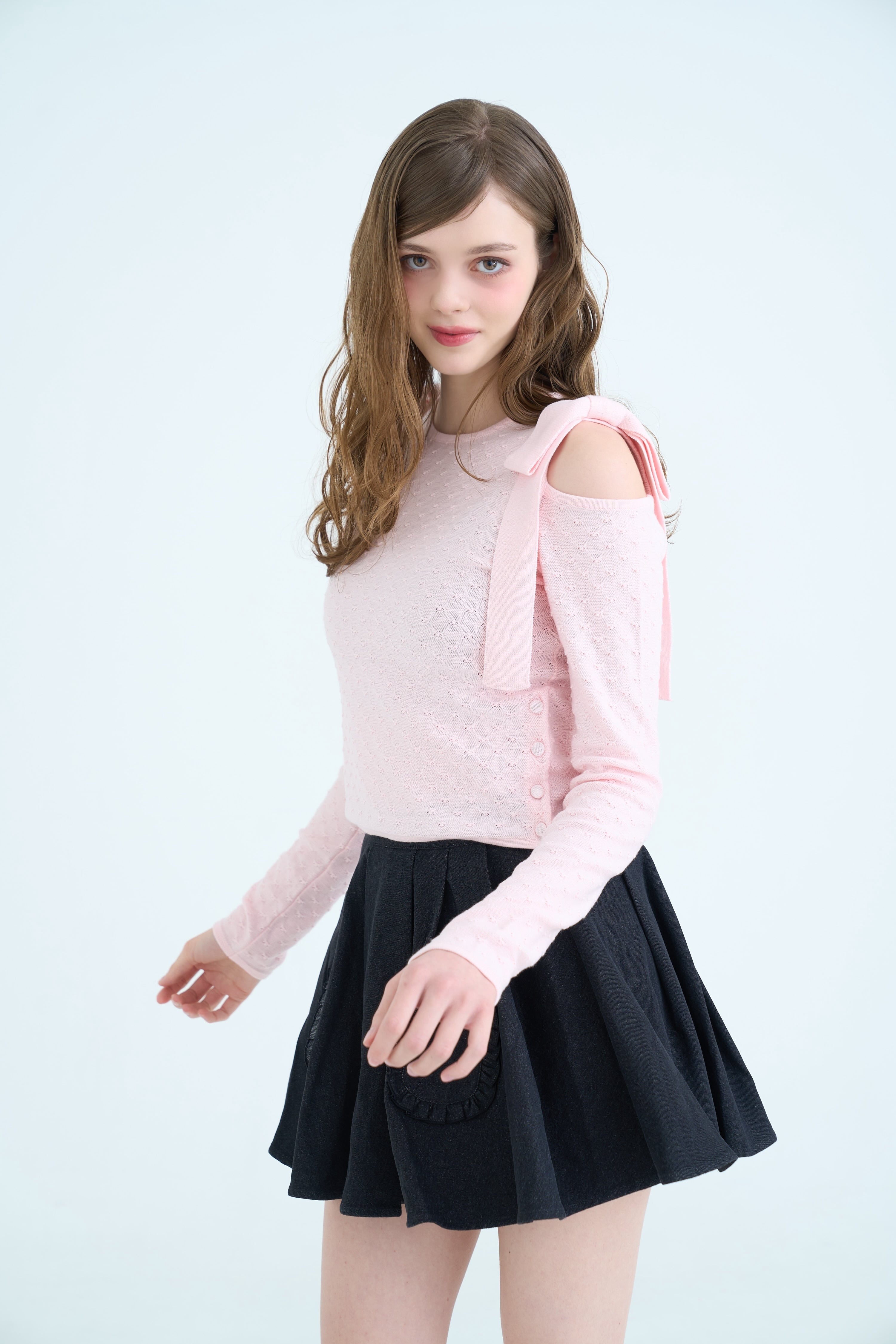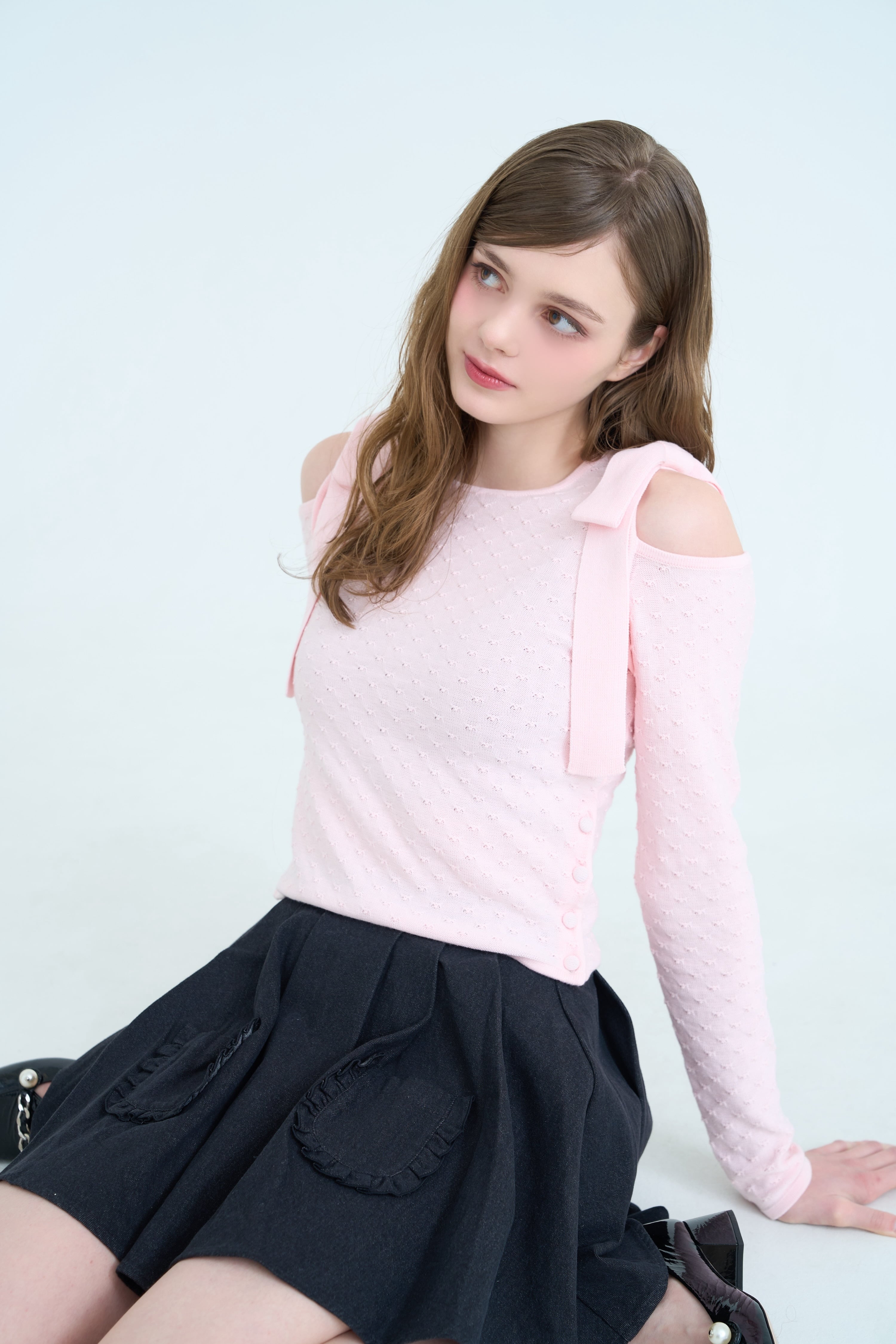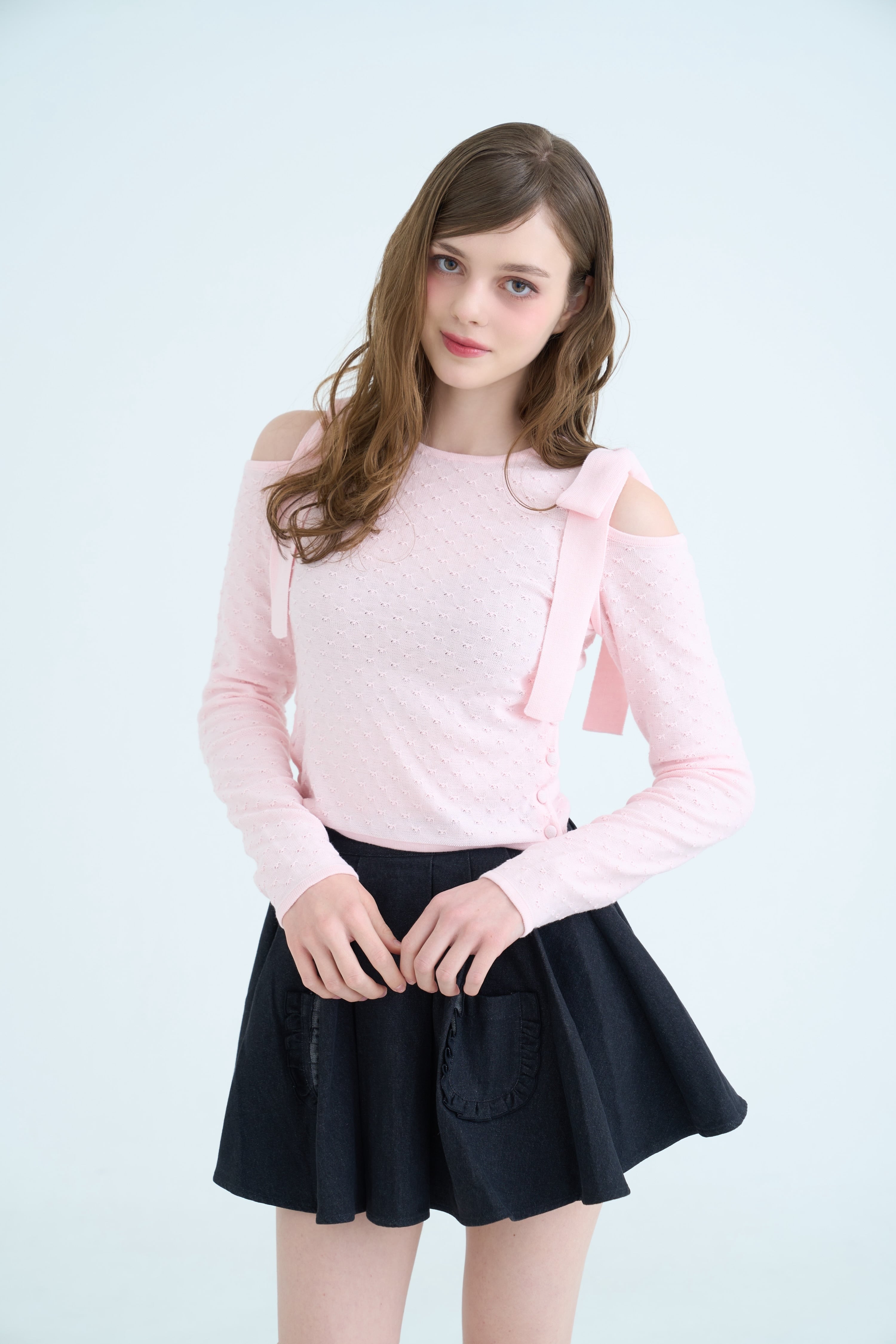 さりげない肌見せのショルダーデザインで、甘さの中に大人っぽさもプラスしました。
