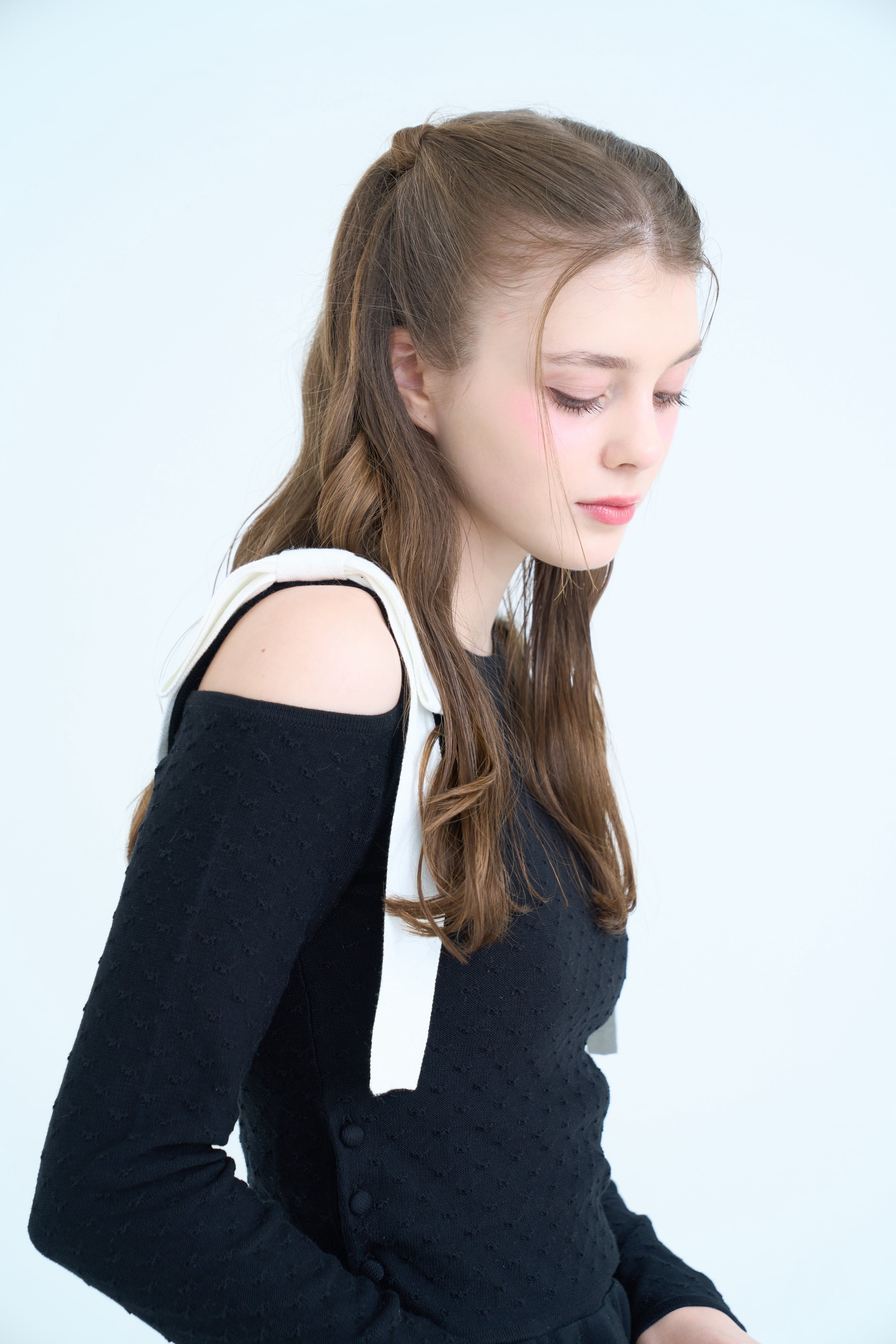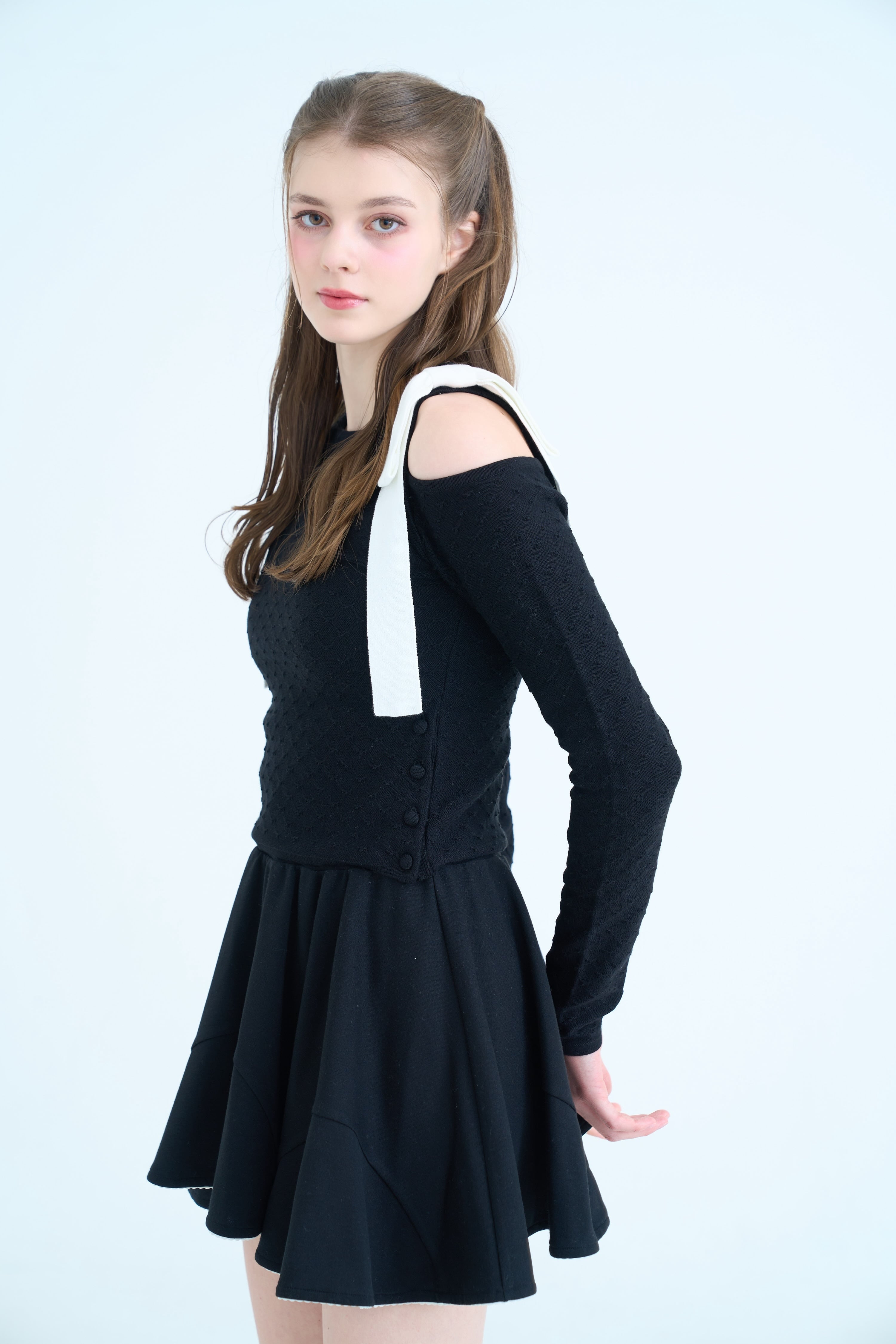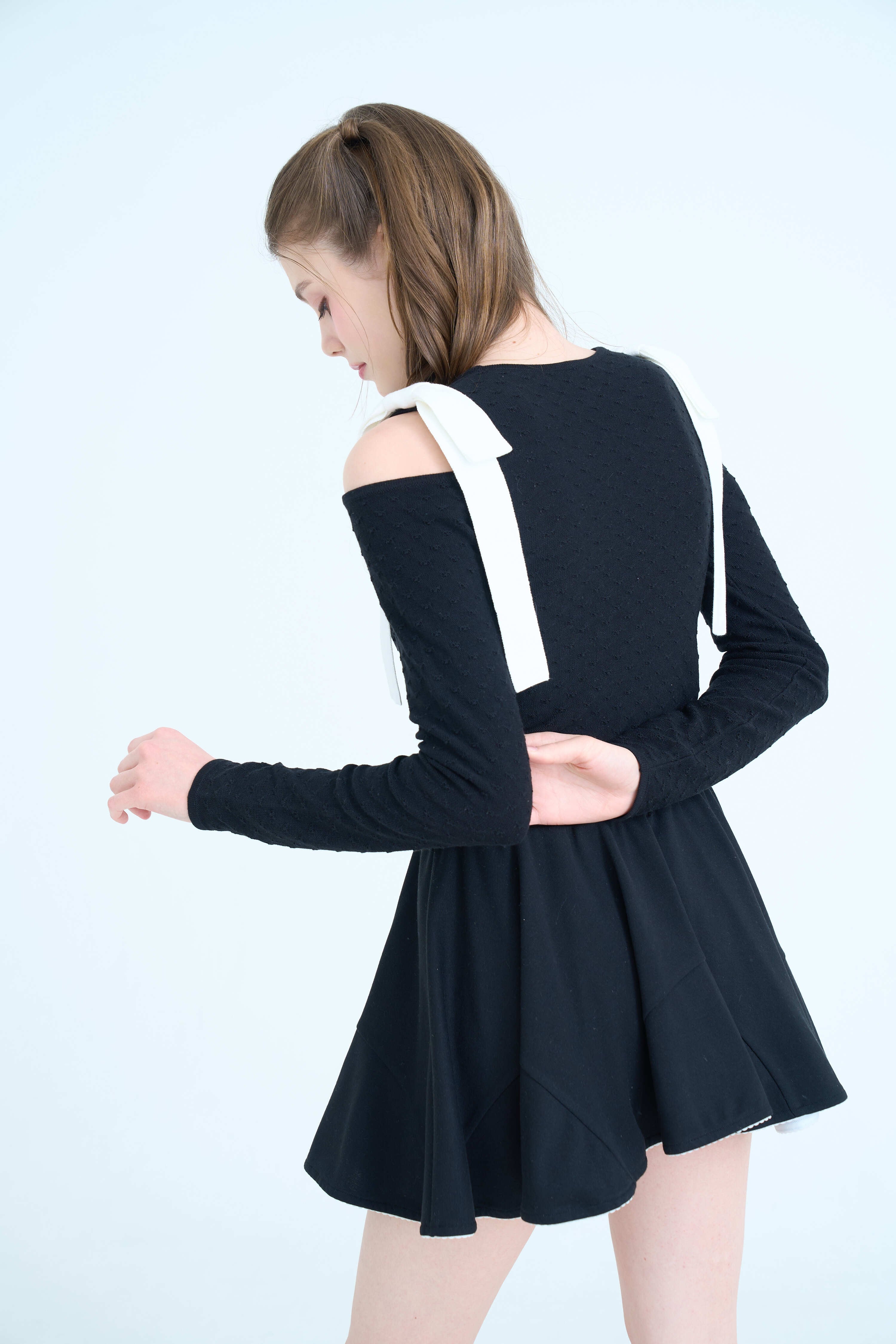 さりげない肌見せのショルダーデザインで、甘さの中に大人っぽさもプラスしました。