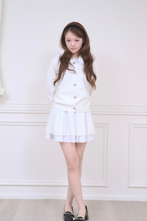 襟にあしらわれたフリルや、スカートの裾から覗くプリーツが動くたびにふんわり揺れてガーリーさを引き立ててくれます。